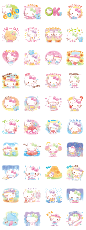 初夏がテーマのハローキティのスタンプです。ふわふわとした水彩画タッチが特徴のかわいいスタンプとなっています!