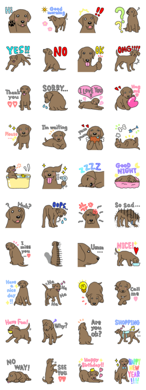 大型犬ラブラドールレトリーバーの簡単な英語を使った可愛いスタンプです。チョコラブです!ばん より発売
