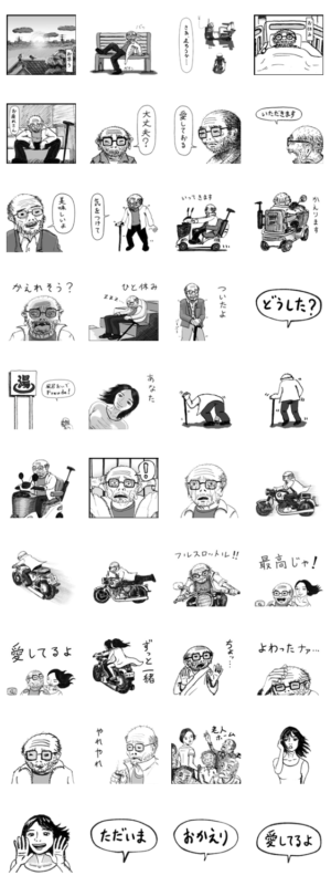 これはシニアカー乗りのお爺さんが織りなす感動のスタンプです。今はシニアカー乗りでしたが昔は単車乗りでカミナリ族だったようです。風に抱かれた音速の天使~第2話伊達新之助 より発売