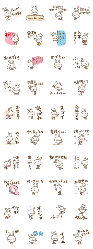 ウサギなだけに第5弾。今回はお祝い編。「誕生日おめでとう」から「あっぱれ」まで。誕生日や卒業、入学祝い等にも使えます。頑張っている、家族、友人にエールを送ろう。Mami / エストループ より発売