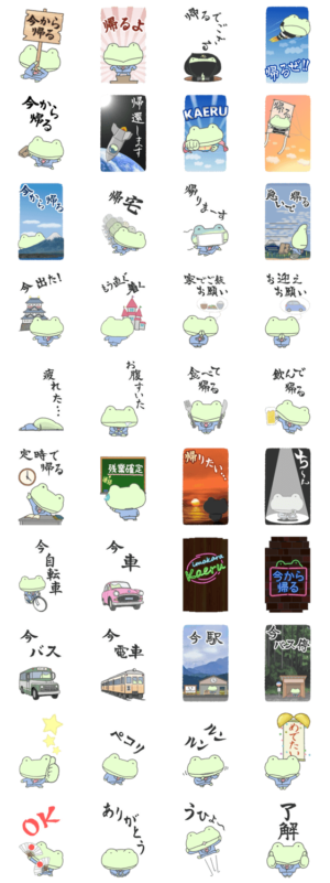 人気の蛙(かえる)の帰るコールBIGスタンプ。お父さん/サラリーマンへ!今から帰る/かえるよ/今電車等、家族に送る帰宅連絡に使える。了解/ありがとう等のお返事付き! ※このスタンプはトークルームで大きく表示されるBIGスタンプです。studio ケロ より発売