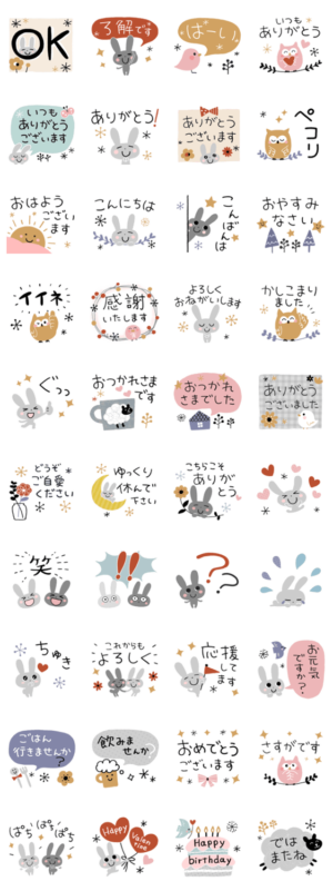 だいすきな人に感謝の気持ちを伝えよう。 シンプルで使いやすいスタンプです。人気のうさこ&ふくろうさんシリーズ。うさぎ/ふくろう/敬語ひらりーー より発売