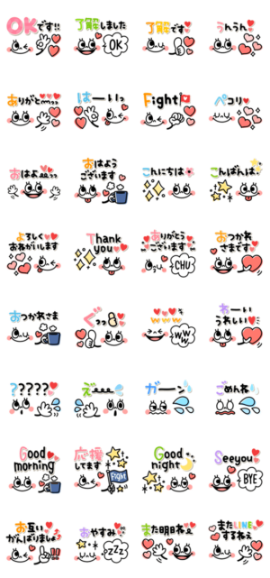 カラフルで可愛い毎日使えるスタンプです。 よく使う日常言葉を集めました♡伝わるリアクション MIX 敬語/大人かわいいハンドサイン/BIGスマイル/かわいい/ハート/家族ちゃぴ より発売