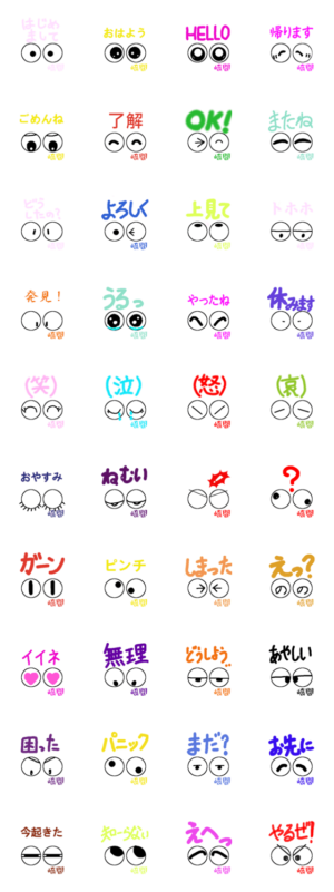 かわいい目玉の日常会話・あいさつ・気持ち 了解 はじめまして おはよう HELLO 帰ります ごめんね またね どうしたの? よろしく 上見て OK トホホ 今起きた