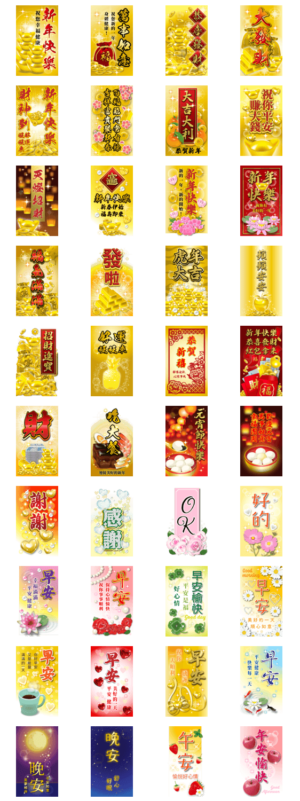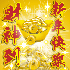 春節おめでとう! 金色に輝く豪華な新年スタンプ!見ているだけで金運が上がっていい年になりそう!台湾や香港で使われる中国語繁体字。 日常会話のスタンプもあるよ! ※このスタンプはトークルームで大きく表示されるBIGスタンプです。copochan より発売
