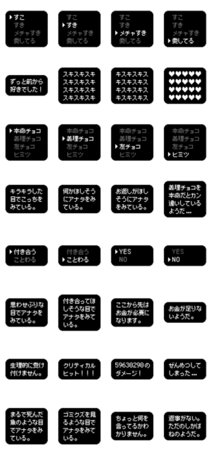 懐かしのRPGゲームのクエストに出てくるドットコマンド風スタンプ。ドラゴンは倒せませんが、バレンタイン系メッセージも収録していて気軽に気持ちを伝えられます。