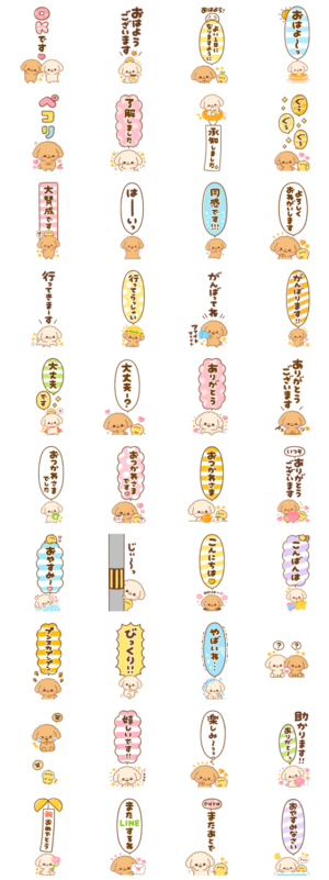 毎日役立つ内容を取り揃えたトイプードルのモカちゃんとラテくんのカラフルで大人可愛いほのぼのスタンプ♪毎日使える敬語や♡よく使う言葉が満載です♪ぴよたぬ動物園