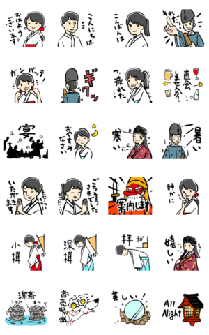神主と巫女さん、時々その他のスタンプです。 前作より少しポップになったかもしれません。 女性神職も加わって幅が広がりました!川良くも より発売