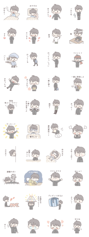 学生さん向けの、友達や彼女への連絡に便利なスタンプです。関連用語:男の子/カップル/彼氏/高校生/中学生/好き/テスト/日常/会話/制服/学ラン/受験生/勉強/学校