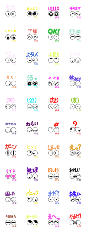 かわいい目玉の日常会話・あいさつ・気持ち 了解 はじめまして おはよう HELLO 帰ります ごめんね またね どうしたの? よろしく 上見て OK トホホ 今起きた