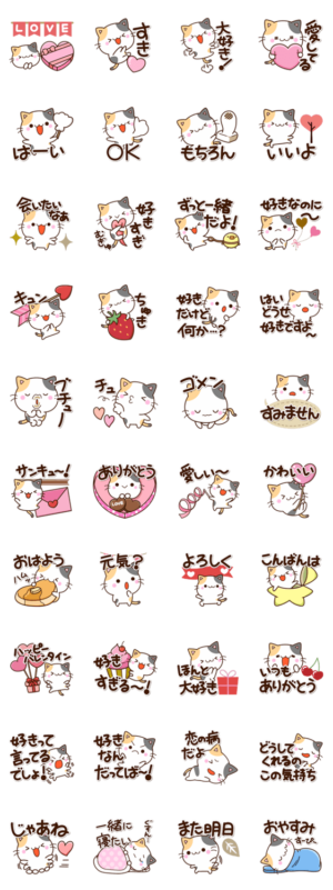 『ちびミケ』の三毛猫スタンプの、恋人、夫婦、バレンタイン等、好きな人に思いを伝える、ねこスタンプ。ちいさくて、かわいいみけネコが気持ちを代弁します。【かたこ】