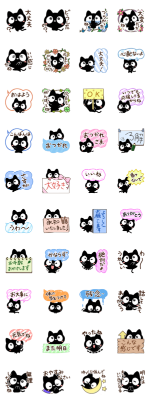 『クロネコすたんぷ』の【やさしい気持ち】編。好きな人や、家族友達など身近な人へ応援のメッセージを送ることができる黒猫スタンプ。くろねこ好きな方にぜひ。【かたこ】
