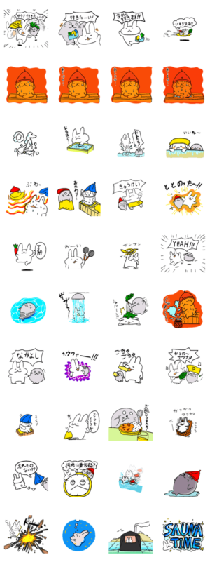 友達のアザラシと一緒にサウナやお風呂を堪能するうさぎのゆるふわスタンプです。oh somekawa より発売