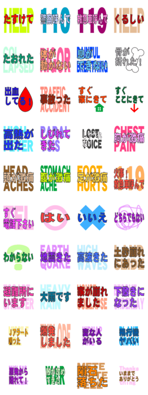 SOS、ヘルプ(警察・救急車・消防車・病気・ケガ・地震・高波・台風・土砂崩れ・火事・ミサイル・飛行機事故・交通事故・戦争・原発事故・隕石等)に使うスタンプです。