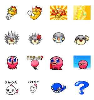 魚系、ハリセンボン、たこ、クジラをモチーフにしたスタンプです。動いて変身したりします♪鎌倉バンザイ!! より発売