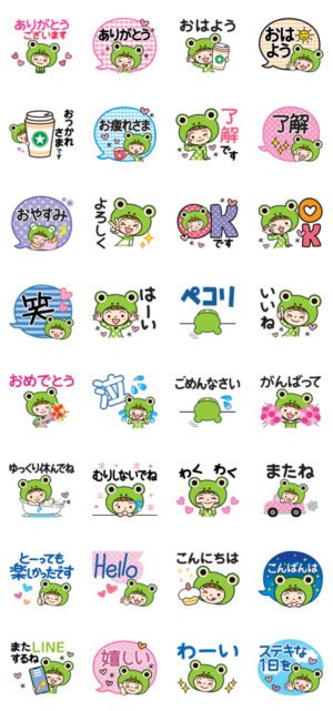 カエルのかぶり物した大人かわいい女子の毎日使えるスタンプ♪親切で丁寧な言葉♪ KEN graphicKEN グラフィック より発売