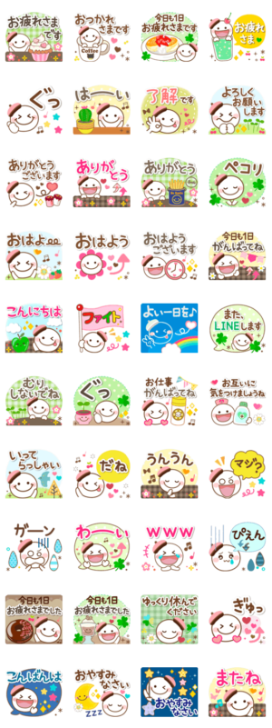 基本の挨拶言葉や人気の表現を集めたスマイルのスタンプです♪グリーンを基調としたシンプルだけど、しっかりめで明るくハッピーになれるようなデザインになっております。