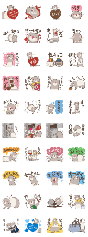 ゆるかわ肉食小動物、フェレットのスタンプです。バレンタインに使えるスタンプを集めました。