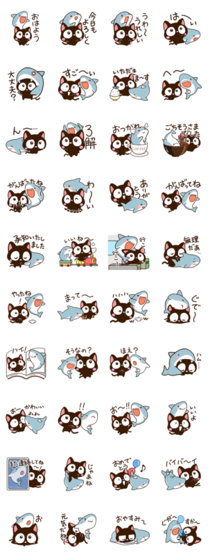 『小さい黒猫スタンプ』と、ちびサメが、かわいく返信します。毎日よく使う言葉から、簡単に反応できるものまで、便利なくろねこと、ちいさい鮫のスタンプです。【かたこ】かたこ より発売