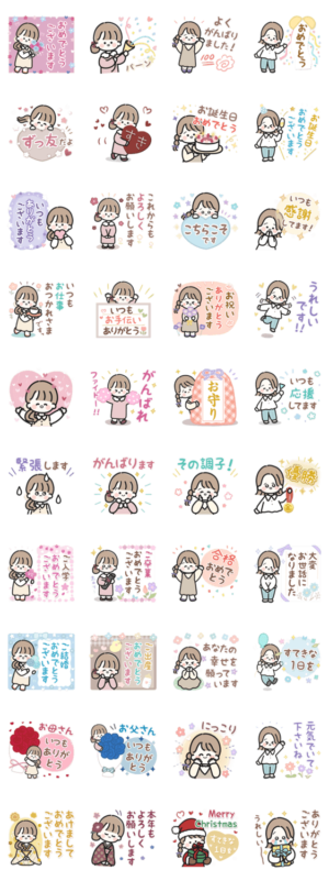 一年間のお祝い行事.応援.感謝の気持ちが伝わる!特別な日のスタンプです。結婚出産祝い.入学卒業祝い.母の日父の日.誕生日.年末年始.シンプルで使いやすい女の子です♪