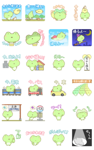 かえるの帰るコールポップアップスタンプ。会社員、愛妻/恐妻家、社畜、学生さんへ!今から帰るなど、帰る時に家族に送る帰宅連絡に便利。お疲れ様等の返事のおまけ付き