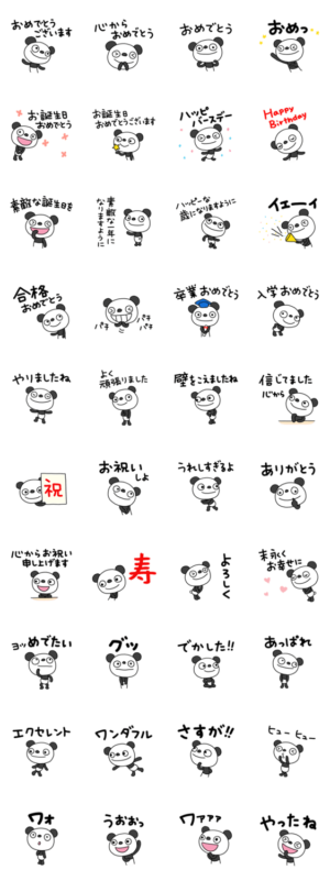 ふんわかパンダ第15弾。お祝い編。「お誕生日おめでとう」から「あっぱれ」まで。お誕生日、合格祝い、卒業・入学、ご結婚。お祝いの言葉を、ふんわか届けよう。