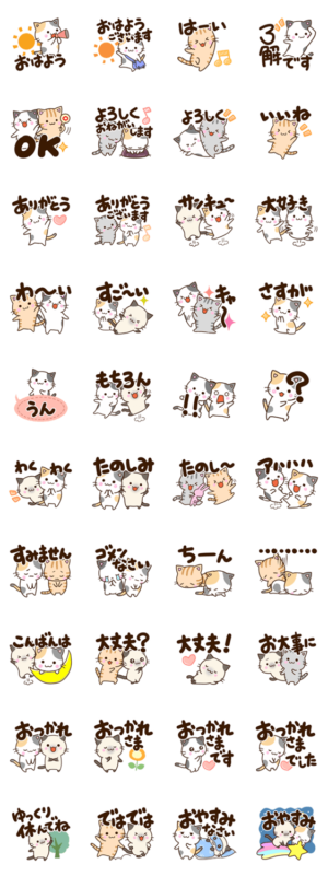 『おちゃめなネコたち』のシンプルで使いやすい猫スタンプ。「おはよう」から「おつかれ」「おやすみ」まであります。三毛猫やシャムねこ等が好きな方にぜひ。【かたこ】