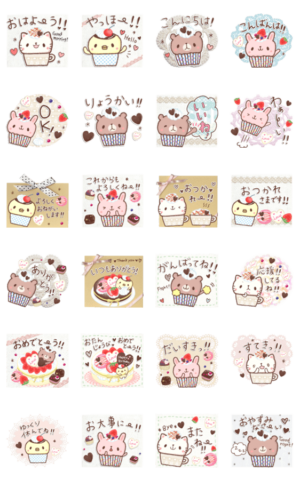 美味しそうなスイーツキャラ。くまショコラ、うさベリー、ねこマキュアート、ぴよプリンのエフェクトスタンプ。毎日使える、思いやり、気遣い、応援、お祝い、誕生日など。
