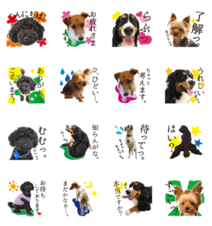 可愛い看板犬たちの日常で使えるスタンプです。 プードル/ジャック・ラッセル・テリア/バーニーズ・マウンテン・ドッグ/ヨークシャテリア