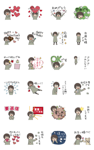 眼鏡女子シリーズの動くスタンプです。バレンタイン、お誕生日、毎日のやり取りに、気持ちを伝えるスタンプです。