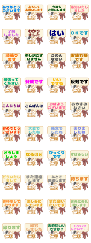 大きな文字で読みやすいかわいい犬スタンプ。大人の日常会話。ありがとうございます。今後もお願いします。お疲れ様です。頑張ってください。承知しました。名前苗字