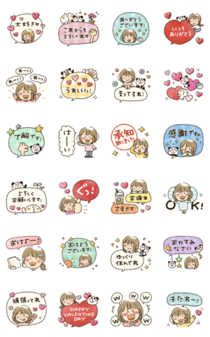 感謝の気持ちを伝える女の子のアニメーションスタンプです!パンダさんとくまぴもいます!敬語/大人/バレンタイン/ハート/好き/大人/動くスタンプかなぴ より発売