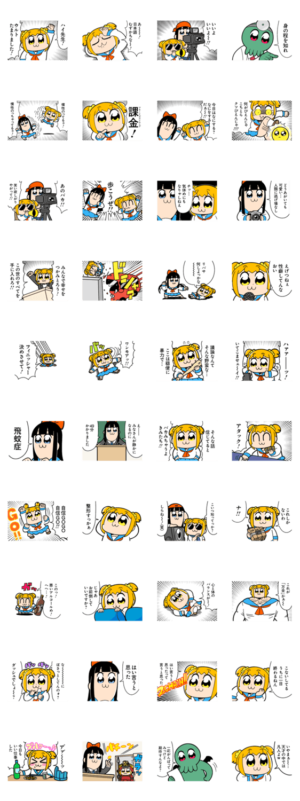 かの有名なポプテピピックのスタンプです。ネタが分かり、同世代でなんでもいえる友達同士で使えます。送り先を間違えるとあわや大惨事になるかもしれません。しかし、ノリが良く楽しいチャットにはもってこいのスタンプです。