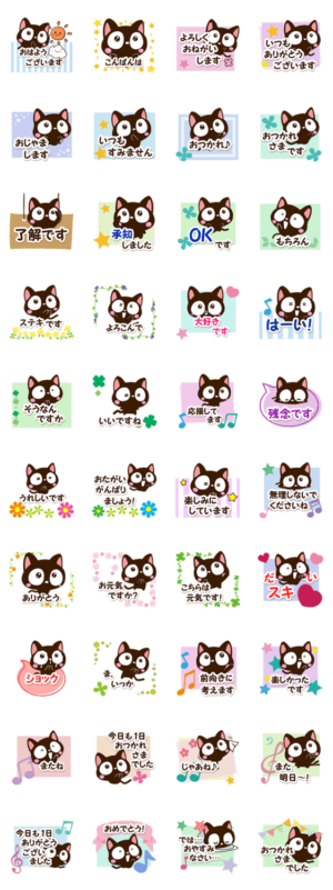 『小さい黒猫スタンプ』の春色の飾りが付いた便利なスタンプです。「おはよう」から「おやすみ」まである、基本的なクロネコスタンプ。くろねこ好きな方にぜひ。【かたこ】