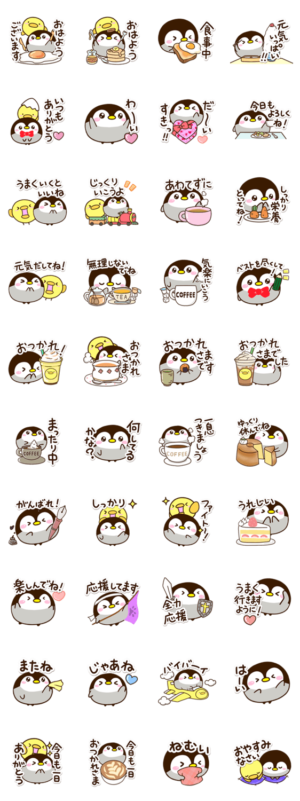『もちっペ』のペンギンスタンプから、相手を思い労わる【応援・気づかい】編。好きな人や、家族、友達など身近な人へ励ましのメッセージを送ることができます。【かたこ】