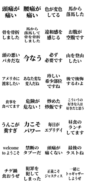 【ネタ/煽り/どや顔/面白い/愛/返信/便利/使いやすい/ムカつく/友達/感想/適当/少年/かっこいい/あるある/ウザイ/暇/親切/回りくどい/パワー】