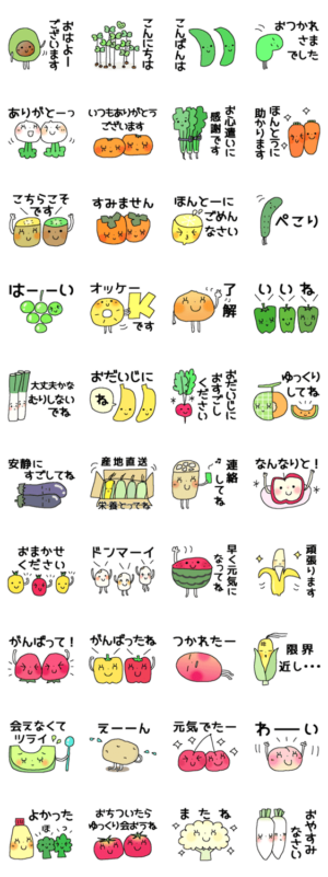 いろいろある毎日に、やさしい気持ちの農作物さんたちが癒してくれるかもしれない40個。大きな文字が見やすくてサクっと送れる目にもやさしいスタンプです。
