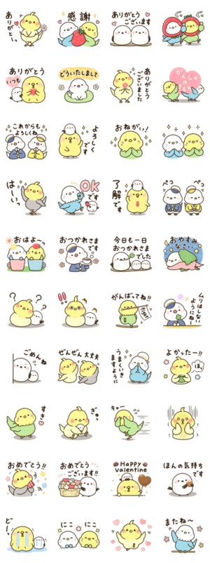 感謝の言葉や気持ちを伝える、ぽっちゃりした鳥さん(文鳥・セキセイインコ・オカメインコ・シマエナガ・ひよこさん)のスタンプです。