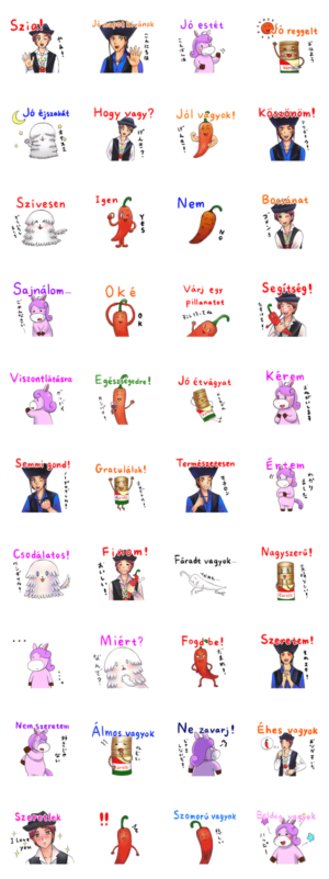 ポニーとクルトシュとパプリカとコモンドールとマジャル(ハンガリー)男子の、マジャル(ハンガリー)語と日本語のスタンプ。スロヴァキア(スロバキア)語もよろしく。