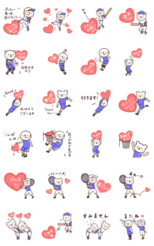 画面背景で動く、'僕とくま'がハートで球技をしているエフェクトスタンプです。画面から飛び出すポップアップverは作品一覧からどうぞ♪野球/サッカー/バスケ/バレーボールmamashka より発売