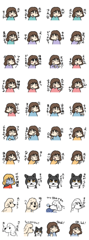 ホヤモンデな伊勢弁を話す子のスタンプです。モデルの子のペットの猫1と犬2、赴任先シンガポール訛りの英語「シングリッシュ」を含みます。