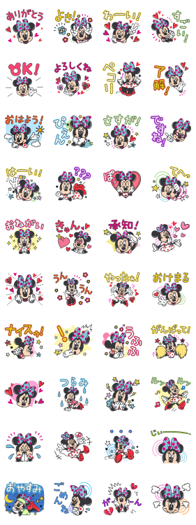 ミニーマウスのポジティブなスタンプ登場!前向きな言葉多めで会話を明るく元気に盛り上げます♪ポップなデザインも楽しい!ウォルト・ディズニー・ジャパン(株) より発売