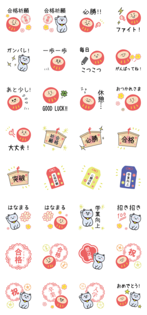 ダルマや招き猫をモチーフにした受験生応援スタンプ。定番の学習シール、お守り、絵馬で受験生にエールとごほうびを。受験生の皆さん、無理せず頑張ってくださいね!