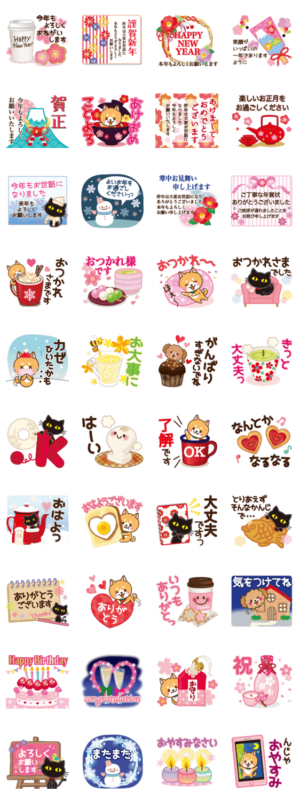 大人が使えるオシャレかわいい年賀スタンプを意識してます♥年末年始を過ぎても長く使えるように、よく使う言葉が多め♪黒ネコ,柴犬,トイプードルの華やか共演で敬語アリ♪紅おれんじ より発売