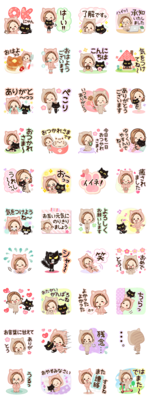 かわいいシンプルな猫耳パーカーコーデの大人女子と黒ねこの楽しい日常を描いたスタンプです★敬語.挨拶.気づかい.春夏秋冬OK!おめでとう(誕生日/卒業入学)女の子あり♡