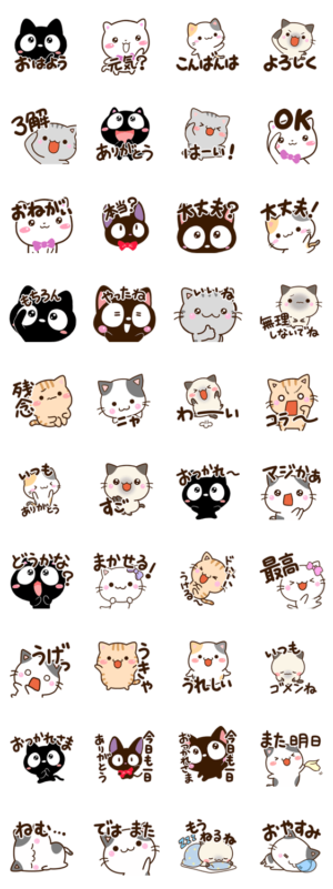 『ちびミケ』の三毛猫や『クロネコすたんぷ』、『やさしいクロネコ』の黒猫等、『かたこ』作成のねこたちのドアップスタンプの第二弾。身近な人に送りやすいスタンプです。かたこ より発売