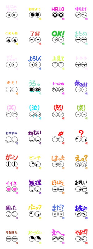 かわいい目玉の日常会話・あいさつ・気持ち 了解 はじめまして おはよう HELLO 帰ります ごめんね またね どうしたの? よろしく 上見て OK トホホ 今起きた