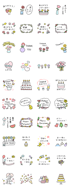 ありがとう系が多めのメッセージスタンプです。 お誕生日やクリスマス、お正月などのイベントスタンプも一通り入っています。