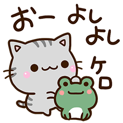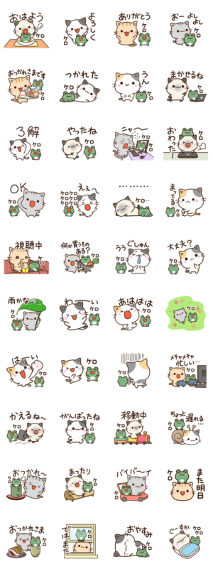 『ちびミケ』の三毛猫や、『ちびシャム』のシャムネコたちと、小さなカエルのコラボスタンプです。ケロケロしゃべります。ねこや蛙キャラ好きな方にぜひ。【かたこ】