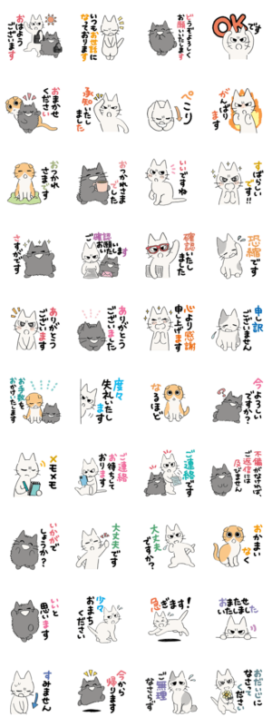 『しかるねこ』のスタンプ、第26弾です。今回はお仕事の連絡に活躍する敬語のフレーズ集です。ビジネスに限らず、普段遣いにも◎。読みやすい大きめ文字。もじゃクッキー より発売